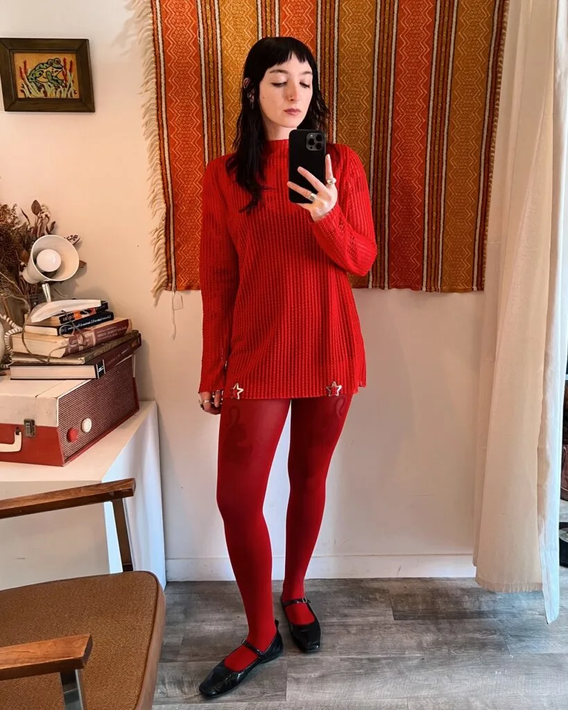 Go all in on color by pairing a vibrant sweater dress with matching red tights. Black ballet flats ground the outfit while letting the red take center stage. This is a standout look for cooler days when you want to stay cozy without sacrificing your edge—playful, bold, and unmistakably stylish.