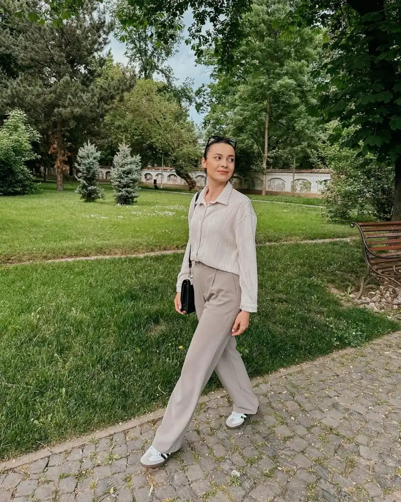 A relaxed striped shirt tucked into taupe trousers creates a light, breezy look. Pale blue Adidas Sambas keep the outfit soft and polished for everyday wear.