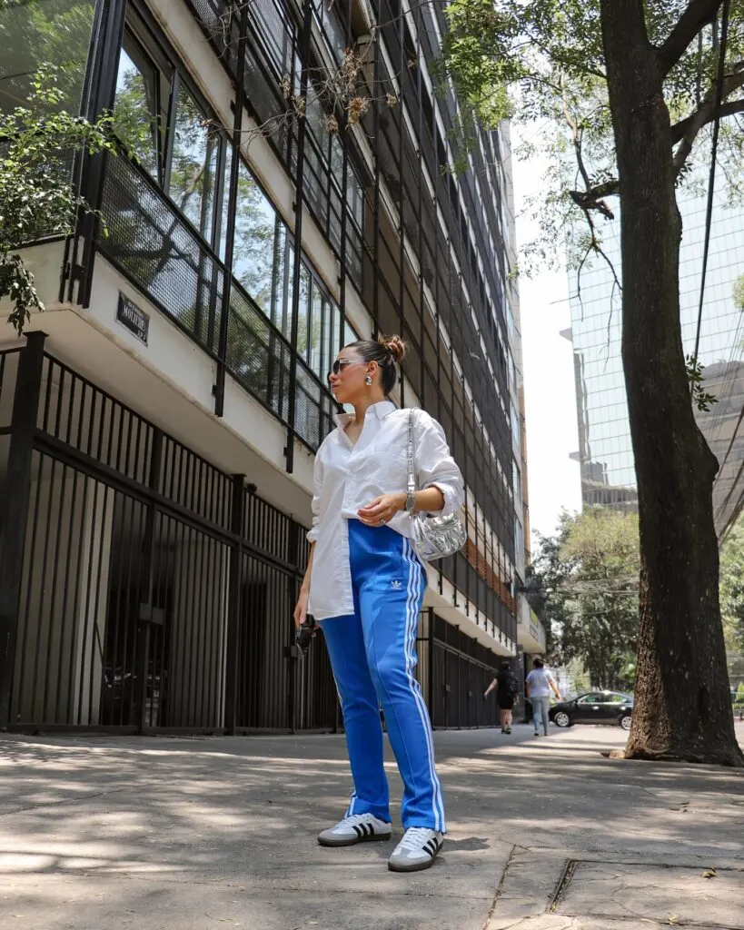 A crisp white button-up pairs effortlessly with bright blue Adidas track pants for a sporty-chic combo. Sambas tie the look together with retro flair.