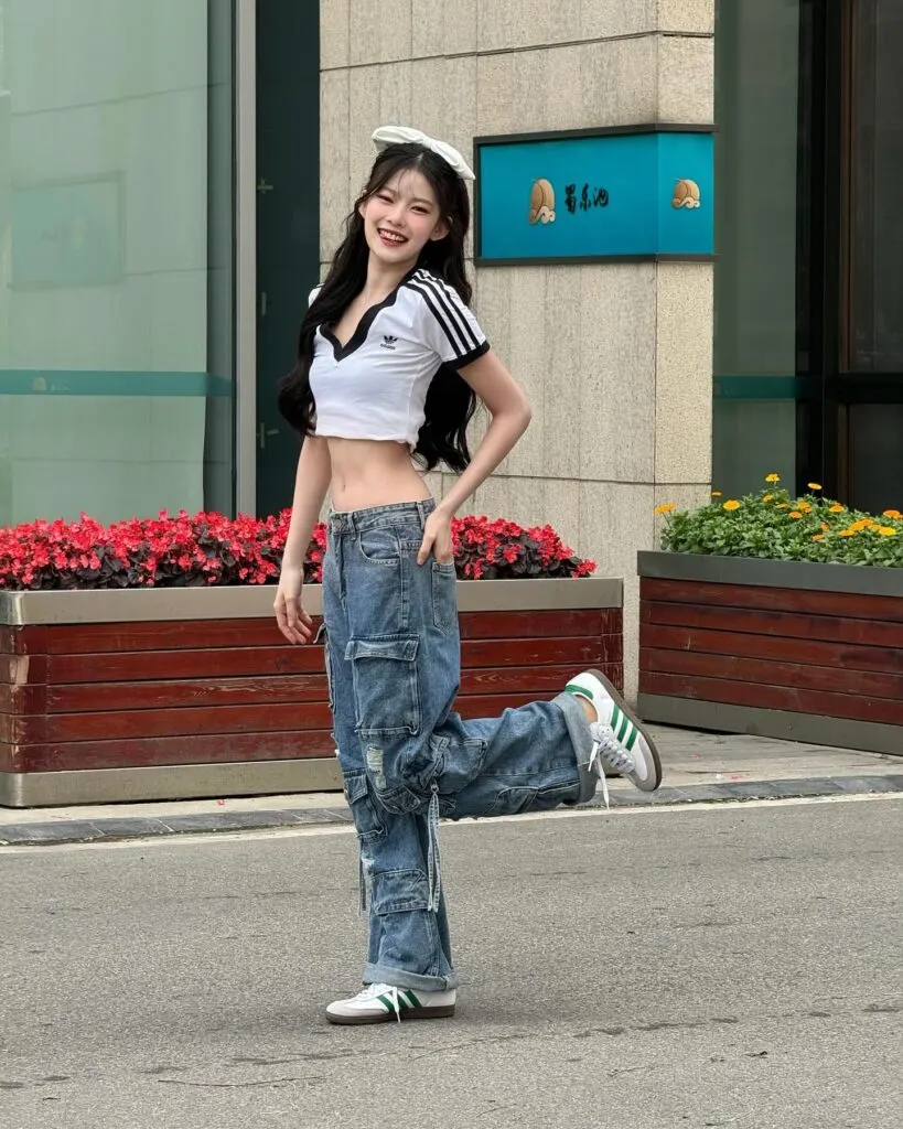 A cropped Adidas polo top pairs perfectly with distressed cargo jeans for a sporty Y2K vibe. Green-striped Sambas add a fun pop of color and attitude.