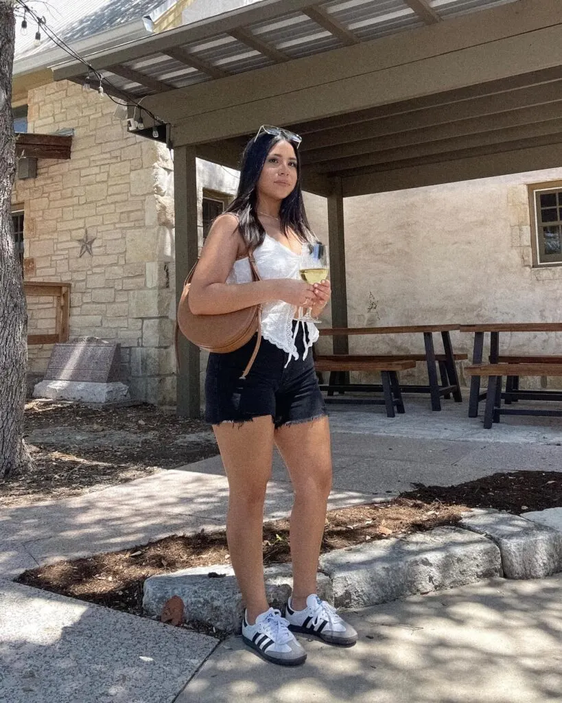 A white lace-trim tank and raw-hem black shorts make for a breezy summer look. Adidas Sambas add a sporty edge to the laid-back warm-weather fit.
