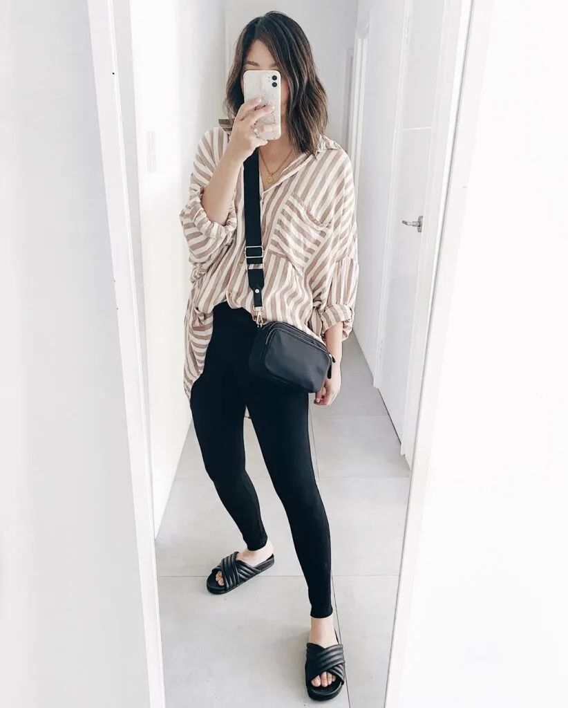 Keep things comfortable and stylish by wearing an oversized shirt with leggings. This is the perfect go-to look for running errands, lounging, or casual outings. White sneakers and a tote bag complete this laid-back aesthetic.