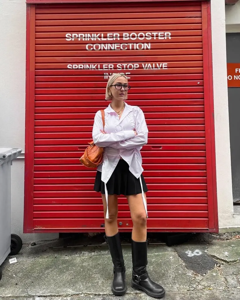 For a flirty yet effortless outfit, wear an oversized shirt slightly tucked into a mini skirt. Opt for flowy or structured skirts, depending on the vibe you’re going for. Layered jewelry and a sleek handbag add the perfect finishing touch.