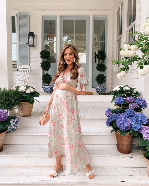 This charming light green maternity maxi dress features a delicate pink and white floral print, creating a romantic and feminine silhouette perfect for a springtime baby shower. The deep V-neckline and playful short ruffle sleeves add a touch of grace, while the empire waistline naturally accommodates the baby bump with both comfort and style. Paired with elegant white block heels and a small pink clutch bag, this polished look ensures the host feels radiant and confident during her special day or a memorable maternity photoshoot on a charming porch.