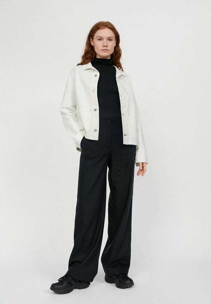 This chic monochrome look is perfect for straight body shapes because it adds subtle structure without overwhelming your natural silhouette. The crisp white jacket brings light and balance to the upper body, while the black turtleneck creates clean vertical lines that elongate the frame. Wide-leg black trousers introduce gentle volume at the bottom, giving the appearance of more curves and movement. Finished with sleek black sneakers, the outfit feels modern, minimal, and easy to wear—great for casual days when comfort and style need to blend seamlessly.