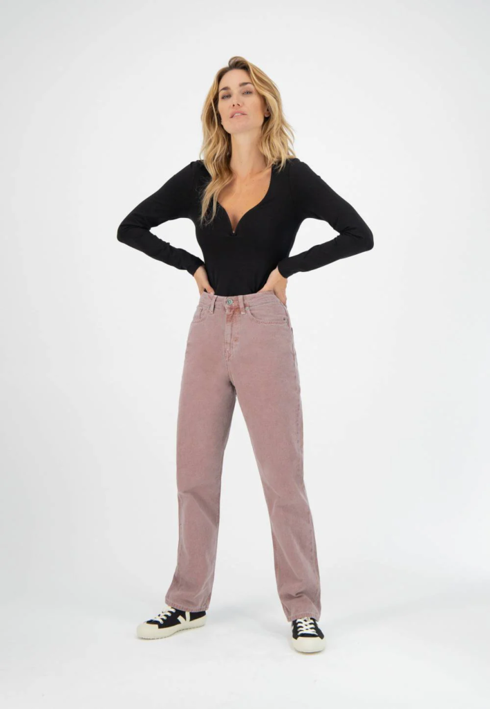 This look pairs a deep-V black fitted top with relaxed, rose-tinted straight-leg jeans for a clean silhouette that gives a rectangle body shape instant definition. The fitted top pulls the waist inward visually, while the looser pants add subtle volume to the lower half, creating curves without trying too hard. Finished with laid-back black-and-white sneakers, it’s an effortlessly cool outfit that turns simple basics into a shape-enhancing, everyday style win.