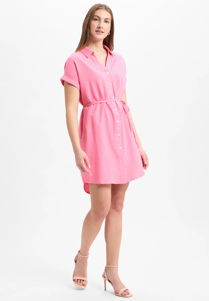 This belted pink shirt dress is a perfect example of how to flatter a rectangle (straight) body shape by adding definition and creating the illusion of curves. The lightweight fabric drapes softly, preventing the boxy look that straight figures often get with structured pieces. The self-tie belt cinches the waist gently, shaping the midsection and giving your frame more femininity and proportion.