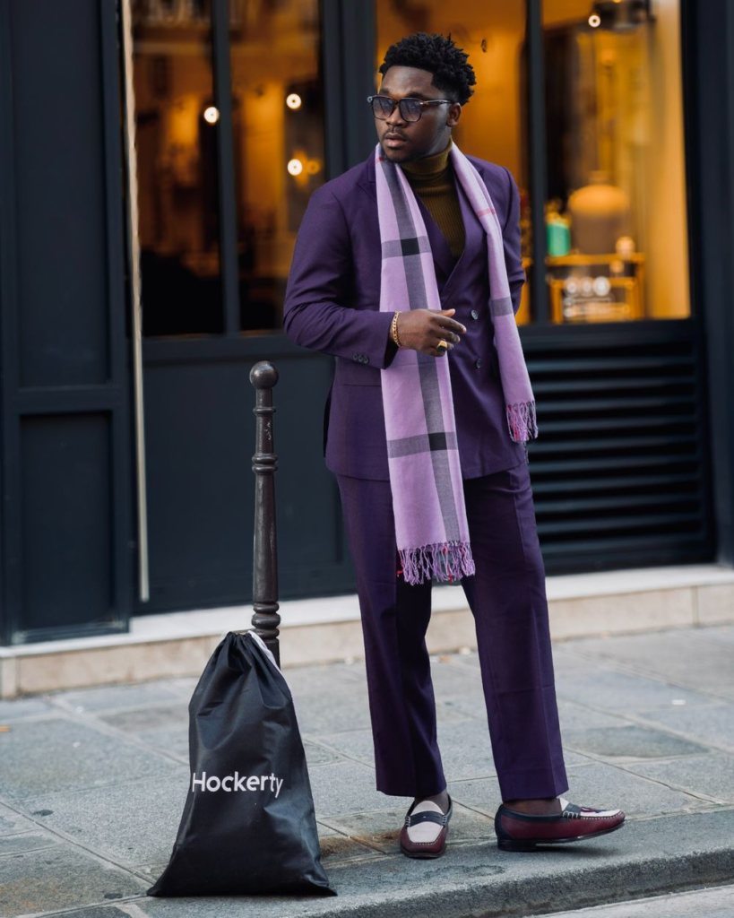This Christmas look blends bold color with refined seasonal elegance. The man wears a deep purple double-breasted suit that instantly stands out, offering a rich, luxurious vibe perfect for holiday gatherings. Underneath, a dark turtleneck adds warmth and modern sophistication. A lavender checked scarf draped around his neck introduces a festive pop of color while softening the strong tailoring. Coordinated loafers with burgundy and cream detailing elevate the outfit further, and sunglasses add a touch of cool confidence. This ensemble is ideal for upscale Christmas parties, holiday dinners, or any celebration where polished style makes a statement.