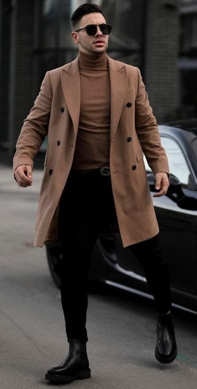 This Christmas look is modern, refined, and effortlessly stylish. The man wears a camel double-breasted overcoat layered over a matching camel turtleneck, creating a warm monochrome palette perfect for the holiday season. Slim black trousers add sharp contrast and keep the silhouette sophisticated, while black Chelsea boots enhance the clean, polished finish. Sunglasses introduce a cool, confident edge, making the outfit ideal for both daytime holiday events and evening gatherings. This ensemble captures a minimalist yet festive vibe—perfect for men who prefer understated Christmas elegance.