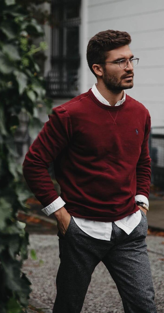 This Christmas outfit captures relaxed holiday style with a polished, timeless feel. The man wears a rich burgundy sweater—a perfect festive color—layered neatly over a crisp white button-down shirt for a clean, classic look. Grey textured trousers add sophistication and seasonal warmth, while the casual layering keeps the outfit comfortable and easygoing. The subtle holiday vibe is created through the deep red tones and cozy winter layers, making this ensemble ideal for family gatherings, casual Christmas outings, or festive daytime events.