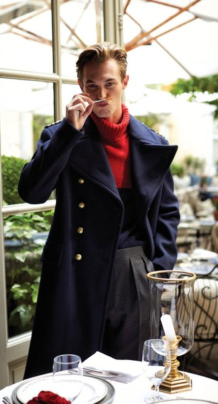 This Christmas outfit blends timeless sophistication with festive color. The man wears a long navy overcoat featuring bold gold buttons, giving the look a refined, almost regal feel. Underneath, a vibrant red turtleneck sweater adds the perfect touch of holiday warmth and cheer. High-waisted charcoal trousers elevate the silhouette with a tailored, vintage-inspired finish. The stylish setting—complete with candlelit tables and elegant décor—enhances the outfit’s polished, celebratory mood. This ensemble is an ideal choice for Christmas dinners, upscale holiday events, or any occasion where classic charm meets seasonal flair.