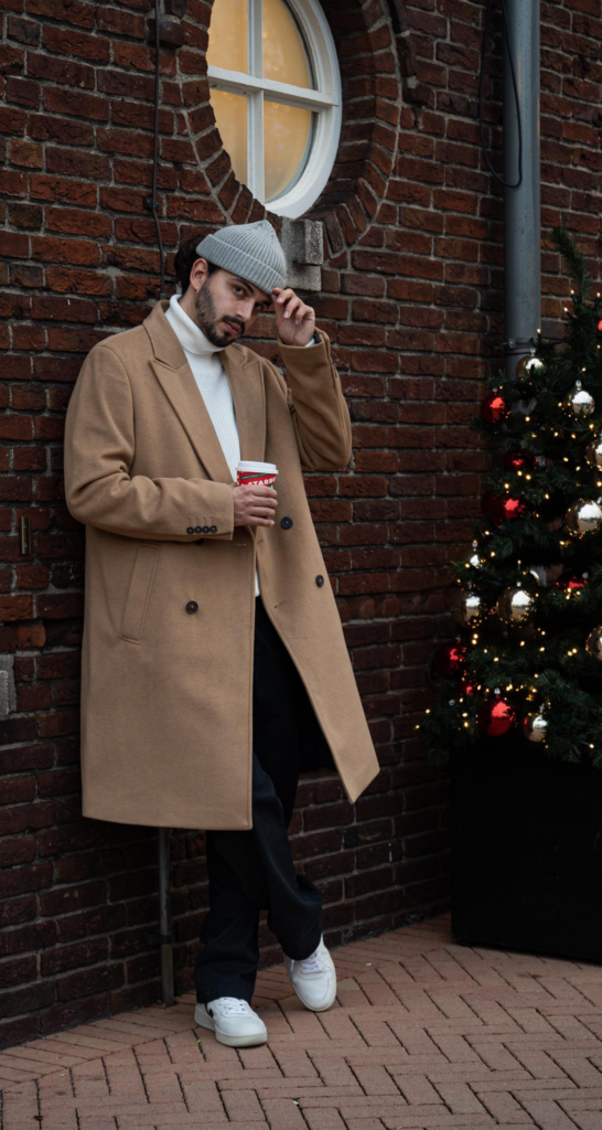 This Christmas outfit delivers warm, effortless holiday style with a relaxed, modern feel. The man wears a soft camel overcoat layered over a chunky white turtleneck sweater—an inviting combination perfect for chilly December days. A light grey beanie adds a cozy seasonal touch, while dark trousers and clean white sneakers keep the outfit grounded and contemporary. Holding a festive red holiday cup beside a decorated Christmas tree, he embodies casual Christmas charm. This look is ideal for Christmas market strolls, casual gatherings, or festive daytime outings.