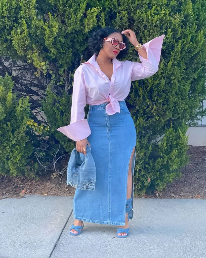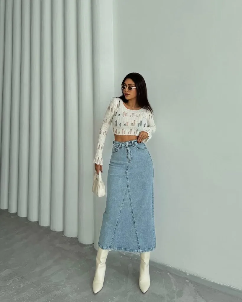 A denim slit skirt pairs beautifully with a fitted bodysuit, a tucked-in button-down shirt, or an oversized sweater. For shoes, opt for heels or knee-high boots for an elongated look.