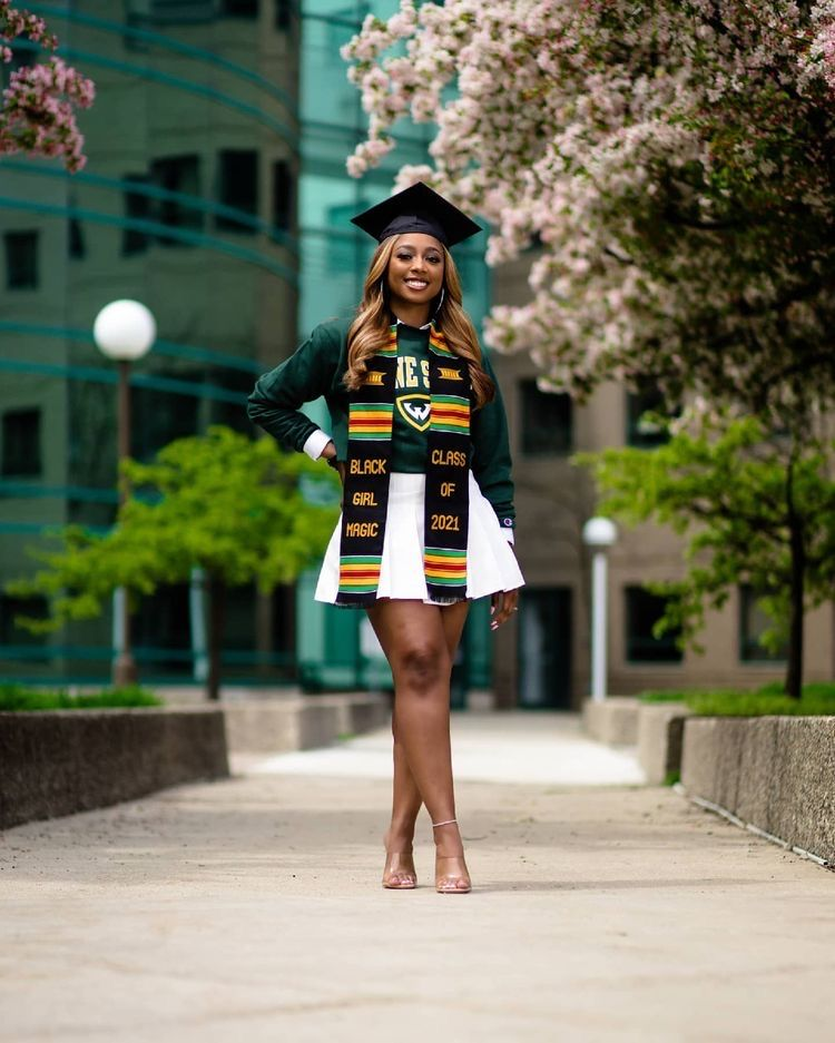 This confident graduation look features a dark green sweatshirt elegantly paired with a crisp white high-waisted pleated mini skirt, creating a modern and celebratory silhouette. The ensemble is highlighted by a “Black Girl Magic Class of 2021” sash and a traditional cap, adding a personal and powerful statement to her achievement. Paired with minimalist nude strappy heels, this polished outfit seamlessly transitions from the commencement ceremony to a stylish post-graduation celebration with family and friends.
