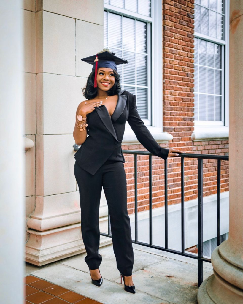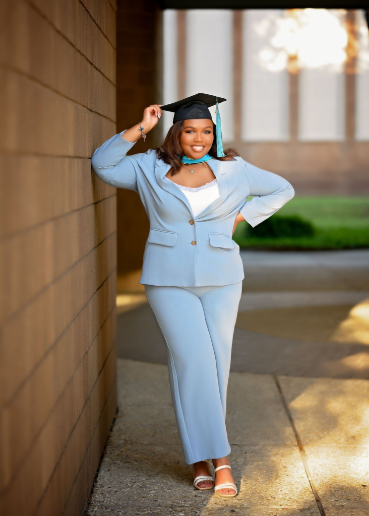 This commanding graduation look, featuring graduate Brittany Thomas, showcases a tailored, light blue pantsuit with a sharp blazer and coordinating trousers, creating a modern and confident silhouette perfect for this significant milestone. The clean, elegant aesthetic is complemented by a simple white top underneath, classic white heeled sandals, and a traditional black cap and teal stole, which adds a personal touch to her academic achievements in Public Administration. This timeless and sophisticated outfit is an ideal choice for walking across the stage or for the stylish post-graduation celebrations and photographs with family and friends.