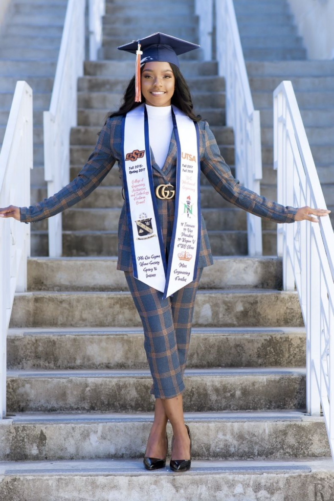 This commanding graduation look features a tailored blue-and-brown plaid pantsuit with a sharp blazer and coordinating ankle-length trousers, creating a modern and confident silhouette that is both professional and stylish. The structured suit is elegantly layered over a crisp white turtleneck, cinched at the waist with a chic Gucci double G buckle belt for a touch of designer flair. Paired with classic black pointed-toe heels and accented by a festive graduation cap and university stoles for UTSA and OSU, this timeless outfit is an ideal choice for walking across the stage or a sophisticated post-graduation celebration with family and friends.
