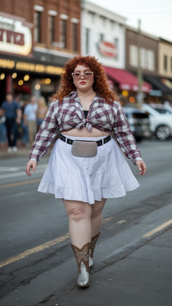 This fun and charming date-night outfit blends flirty feminine details with a touch of Western-inspired flair. The plaid shirt, tied confidently at the waist, adds a relaxed and playful vibe while highlighting the natural curve of the figure. Paired with a twirl-ready white ruffle skirt, the look feels light, breezy, and perfect for warm evenings or outdoor adventures. Eye-catching silver cowboy boots bring bold personality and sparkle, instantly turning the outfit into a standout moment. Accessories like heart-shaped sunglasses, layered pearl jewelry, and a studded belt bag elevate the ensemble with a mix of whimsy and edge. This look is perfect for plus-size women heading to concerts, street festivals, or country-themed date nights—cute, confident, and full of attitude.