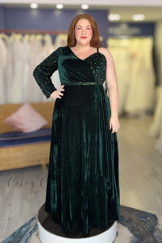This emerald velvet gown is a stunning choice for wedding guests who want a look that feels both regal and unforgettable. The rich, jewel-toned fabric adds instant sophistication, while the asymmetric neckline creates a modern, fashion-forward silhouette. One side features a sparkling sequin sleeve that brings glamour and movement, contrasted beautifully by the sleeveless strap on the other side—an artistic balance that elevates the entire ensemble.
