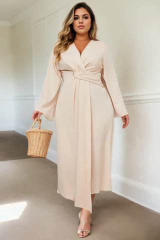 This soft, neutral-toned wrap dress is the perfect choice for wedding guests who love understated elegance and effortless sophistication. The gentle draping and wrap-front detail create a beautifully flattering silhouette, enhancing curves while offering a comfortable, relaxed fit that moves gracefully with every step. The long sleeves add refinement, making this look ideal for semi-formal ceremonies, indoor venues, or transitional-season weddings.