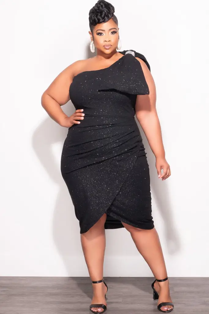 This gorgeous one-shoulder black sparkle dress is the definition of sleek, modern glamour—perfect for an evening wedding where the dress code leans elegant and sophisticated. The asymmetrical neckline with its structured bow detail adds instant drama, drawing the eye upward and creating a beautifully balanced silhouette. Meanwhile, the subtle shimmer throughout the fabric catches the light effortlessly, making the entire look feel luxurious without being overly flashy.