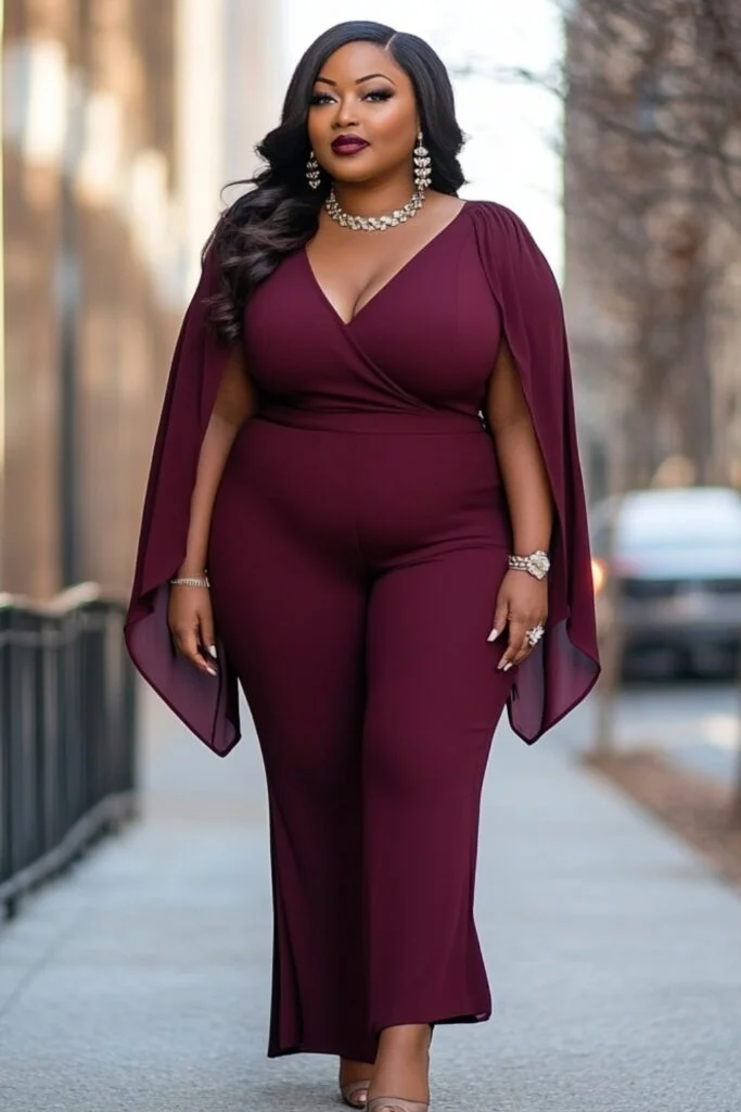 This stunning burgundy jumpsuit is the perfect example of how plus-size wedding guest fashion can be both modern and utterly glamorous. The deep wine tone brings sophistication to any venue—from chic city weddings to upscale evening receptions. Its wrap-style bodice creates a flattering V-neckline that enhances curves beautifully, while the tailored waist and wide-leg silhouette elongate the figure for an effortlessly polished look.