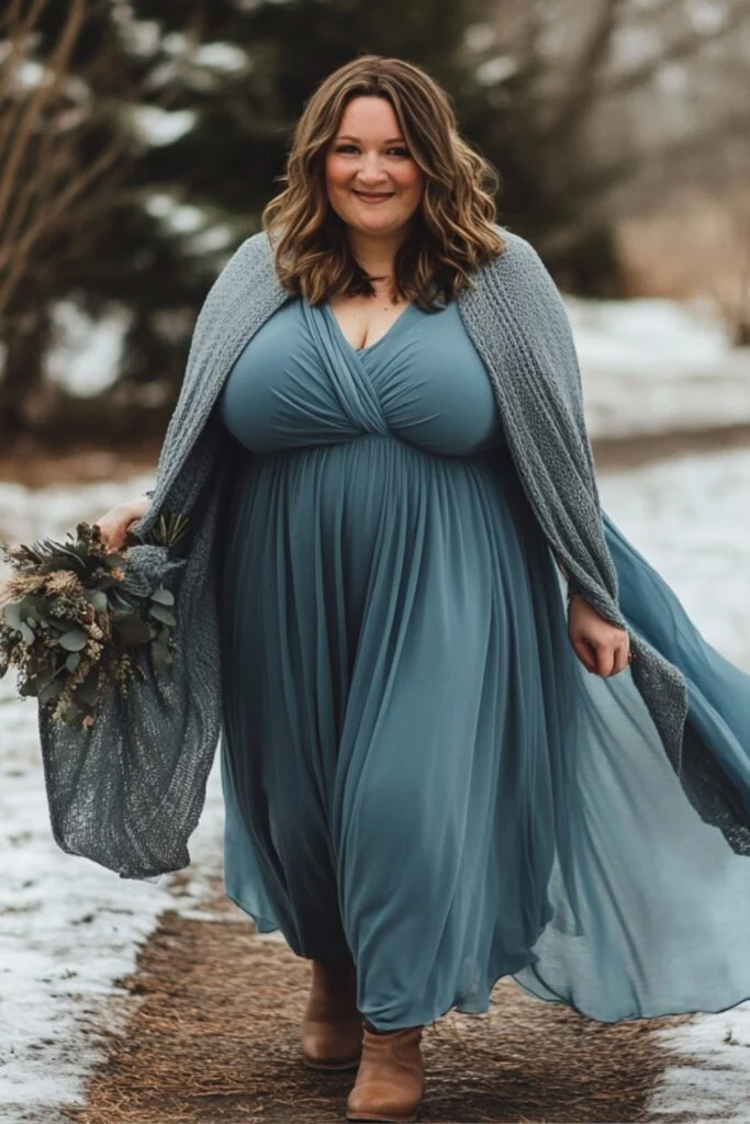 Layered with a textured gray shawl, the outfit feels intentionally seasonal—cozy yet refined. The shawl adds warmth without taking away from the gown’s soft femininity, making it a stylish alternative to a structured coat. Paired with tan ankle boots for comfort on snowy or uneven ground, this ensemble is practical while remaining picture-perfect. It’s the ideal choice for plus-size guests attending a winter celebration where elegance and comfort truly go hand in hand.