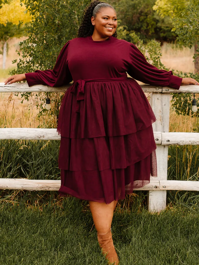 This romantic tiered burgundy dress is a beautiful choice for a plus-size wedding guest who wants a look that’s both graceful and comfortable. The rich wine color feels perfect for fall ceremonies and rustic outdoor venues, while the tiered tulle skirt adds soft volume that moves beautifully with every step. The long, gently puffed sleeves balance the silhouette, and the tie-waist detail helps define the figure without sacrificing ease.
