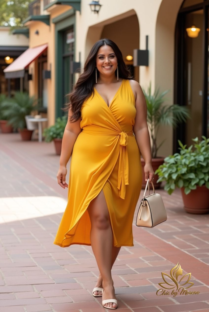 This radiant mustard wrap dress is the perfect choice for a warm-weather wedding, offering a striking balance of elegance, comfort, and curve-loving design. The deep V-neckline elongates the upper body while adding a soft touch of glamour, and the wrap-front silhouette cinches beautifully at the waist to create effortless hourglass definition. The asymmetrical hem brings graceful movement with every step, making the outfit feel light, airy, and ideal for outdoor ceremonies or garden receptions.