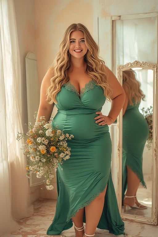 This gorgeous emerald gown delivers a stunning blend of sophistication and curve-enhancing elegance—perfect for both indoor and outdoor weddings. The lace-trimmed V-neckline adds a soft romantic touch, beautifully framing the décolletage, while the body-skimming silhouette highlights natural curves with graceful confidence. Subtle ruching at the waist creates flattering definition, and the asymmetrical hem with lace detailing adds movement and a refined hint of allure. Paired with strappy white heels and minimal jewelry, this look feels polished, fresh, and effortlessly glamorous. Whether attending a spring garden ceremony or a chic evening reception, this dress ensures a radiant wedding guest appearance from every angle.