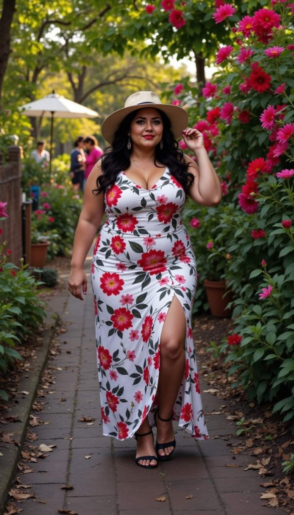 This gorgeous white floral maxi dress creates a stunning wedding guest outfit perfect for outdoor, garden, or summer celebrations. The fitted silhouette beautifully highlights curves, while the vibrant red and pink floral print adds a lively, joyful touch that feels right at home in a blooming setting. A deep V-neckline softens the look with feminine charm, and the thigh-high side slit adds graceful movement and a hint of flirtiness without feeling overly bold. Paired with black strappy sandals and statement earrings, the ensemble feels polished yet effortless. The wide-brim hat adds an elegant, sun-ready touch, making this outfit ideal for daytime weddings where style and comfort go hand in hand.