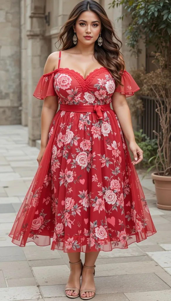 This stunning red floral midi dress creates a beautifully romantic and feminine wedding guest outfit that feels both elegant and celebratory. The sweetheart neckline and delicate lace trim highlight the décolletage with soft sophistication, while the off-shoulder flutter sleeves add graceful movement and charm. The fitted bodice transitions into a flowy A-line skirt adorned with rosy florals, creating a flattering silhouette that enhances the waist and glides effortlessly with every step. The tied sash belt adds a polished finishing touch, ensuring a refined and figure-enhancing fit. Paired with nude strappy heels and statement earrings, this look is perfect for spring and summer weddings—radiant, graceful, and unforgettable.