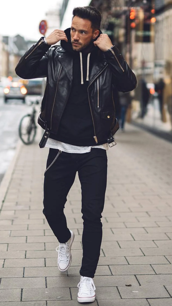 This winter outfit delivers a cool, urban edge with classic streetwear layering. The man wears a black leather biker jacket over a black hoodie with contrasting white drawstrings, creating a bold and effortlessly stylish combination. Slim black pants keep the silhouette sleek, while clean white sneakers add brightness and a sporty finish. A chain detail on the pants enhances the street-style attitude. Overall, this look is warm, modern, and perfect for anyone who wants a tough yet polished winter outfit for city streets or casual outings.