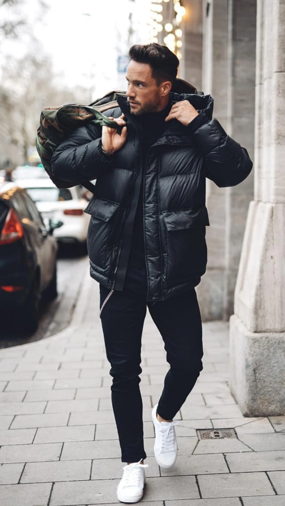 This winter outfit delivers functional warmth with a sharp, modern edge. The man wears a glossy black puffer jacket that provides insulation while keeping the look sleek and contemporary. Underneath, a fitted black top maintains the monochromatic theme, creating a clean silhouette. Slim black pants add to the streamlined feel, while crisp white sneakers introduce contrast and a sporty finish. A camo duffel bag slung over his shoulder adds rugged flair and practical utility. Overall, this is a stylish, everyday winter look perfect for staying warm without sacrificing urban cool.