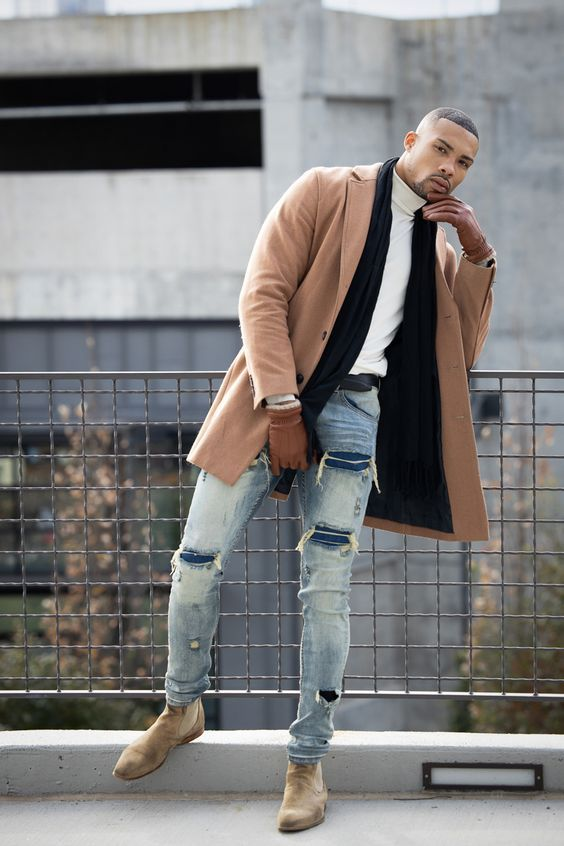 This winter outfit pairs refined classics with modern street style. The man wears a camel overcoat layered over a white turtleneck sweater, creating a clean, polished base perfect for cold weather. A long black scarf adds contrast and warmth, elevating the overall look. Light-wash ripped jeans introduce a rugged, contemporary edge, while tan suede Chelsea boots tie the outfit together with a sleek, fashionable finish. Leather gloves and accessories add subtle sophistication. This ensemble blends elegance with attitude—ideal for stylish winter outings or casual city days.